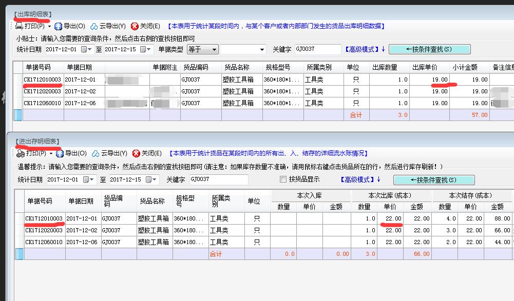 然后,我們再來看一下下面這張截圖,是出庫明細表和統(tǒng)計報表里面的進出存明細表里的數(shù)據(jù),兩張表進行對比??梢钥闯?,統(tǒng)計報表,進出存明細表里顯示的單價為22元。兩個地方明顯不一樣。為什么會出現(xiàn),同一張單據(jù),在兩個地方顯示的單價不一樣這種情況呢?